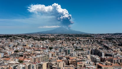 El Etna, el volcán siciliano que se eleva sobre la ciudad de Catania, en el este de la isla, ha vuelto a despertar al mediodía de este lunes con una estruendosa erupción que ha elevado una columna de humo de unos cinco kilómetros y ha originado corrientes de lava. La Protección Civil italiana ha emitido una alerta roja, aunque por el momento la actividad se limita a la zona del cráter, en torno a los 2.800 metros de altitud. En todo caso, las violentas explosiones del volcán más activo de Europa, con fuertes temblores, se han oído en todos los municipios cercanos. A primera hora de la tarde, la magnitud de estos temblores ya se había rebajado, señal de que la fase eruptiva podría estar concluyendo.
