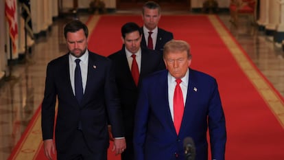 Una de las voces más críticas del trumpismo contra el intervencionismo en la región de Administraciones pasadas, el vicepresidente, J. D. Vance, compareció a la derecha del líder estadounidense cuando este se dirigió a la nación en un discurso breve y contundente desde el salón oriental de la Casa Blanca. Al otro lado, estaban Pere Hegseth, secretario de Defensa, y Marco Rubio, secretario de Estado.
