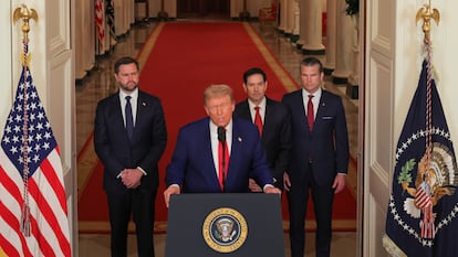 El republicano da el ataque como un capítulo cerrado con la destrucción de las instalaciones iraníes de Fordow, Natanz e Isfahán y ha amenazado a Irán ante una hipotética represalia. “Irán, el matón de Oriente Medio, debe aceptar la paz (...) Si la paz no llega rápidamente, iremos contra más objetivos, con precisión, rapidez y destreza”, ha advertido el presidente, acompañado por el vicepresidente, J.D Vance; el secretario de Estado, Marco Rubio y el secretario de Defensa, Pete Hegseth.
