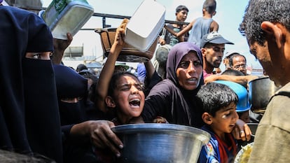 Un grupo de personas intenta conseguir comida en una cocina comunitaria en Jan Yunis, en el sur de la Franja, el 21 de agosto de 2025. / Anadolu / Anadolu via Getty Images