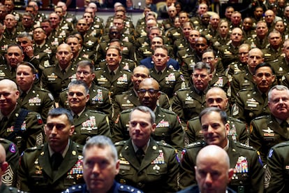En un anfiteatro cubierto, sobre un escenario de color negro repleto de banderas —la estadounidense y las de los cinco ejércitos de las fuerzas armadas estadounidenses (ejército de Tierra, Marina, Fuerza Aérea, Infantería de Marina y Guardacostas)—, el secretario de Defensa, hasta el año pasado presentador de la cadena de televisión Fox News, pronunció su discurso como si se tratara de una charla TED, moviéndose de un lado al otro del escenario, ante centenares de los militares más condecorados y con constelaciones de estrellas en sus charreteras.