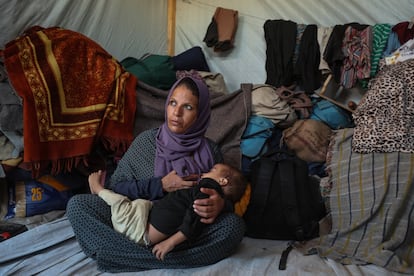 Una mujer palestina desplazada llamada Iman Abdel Halim Abu Mutlaq, se refugia en su tienda de campaña mientras sostiene a sus hijos Uday y Hamza Abu Odah