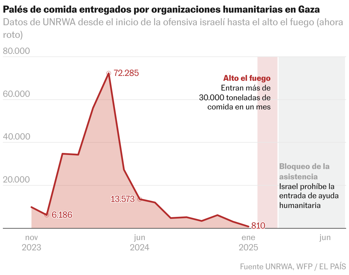Las desavenencias entre el primer ministro israelí, Benjamín Netanyahu, y la organización islamista Hamás sobre el cumplimiento de las promesas pactadas, como en el ritmo y garantías de la liberación de rehenes, hacían más difícil cada día el sostenimiento del alto el fuego. Israel, que acabaría rompiendo esa tregua, cortó prácticamente por completo la entrada de ayuda en la Franja, lo que agravó la crisis humanitaria.
