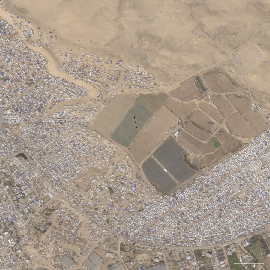 Las poblaciones quedan arrasadas por los bombardeos y sus antiguos habitantes se desplazan y levantan campamentos de tiendas de campaña en los escasos espacios que van quedando. En el sur de Gaza se hacina gran parte de la población gazatí.