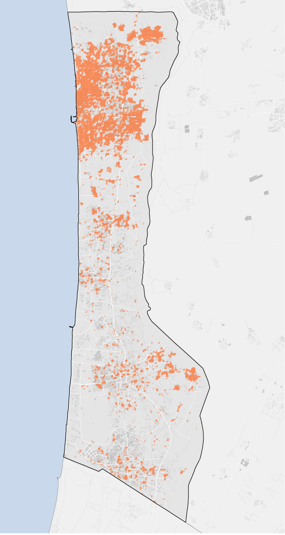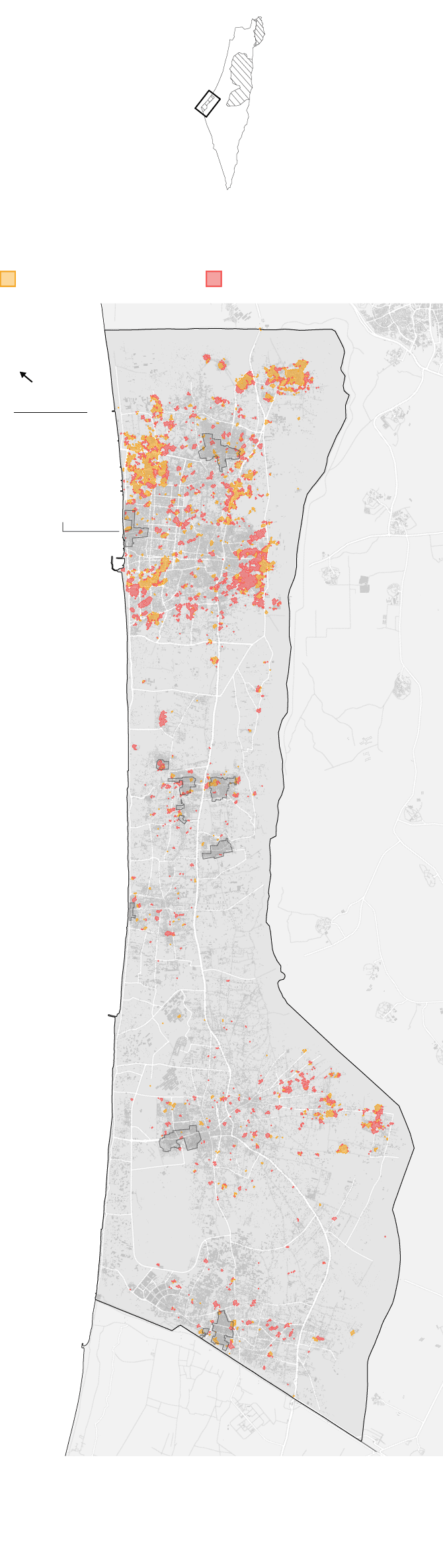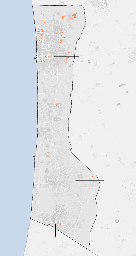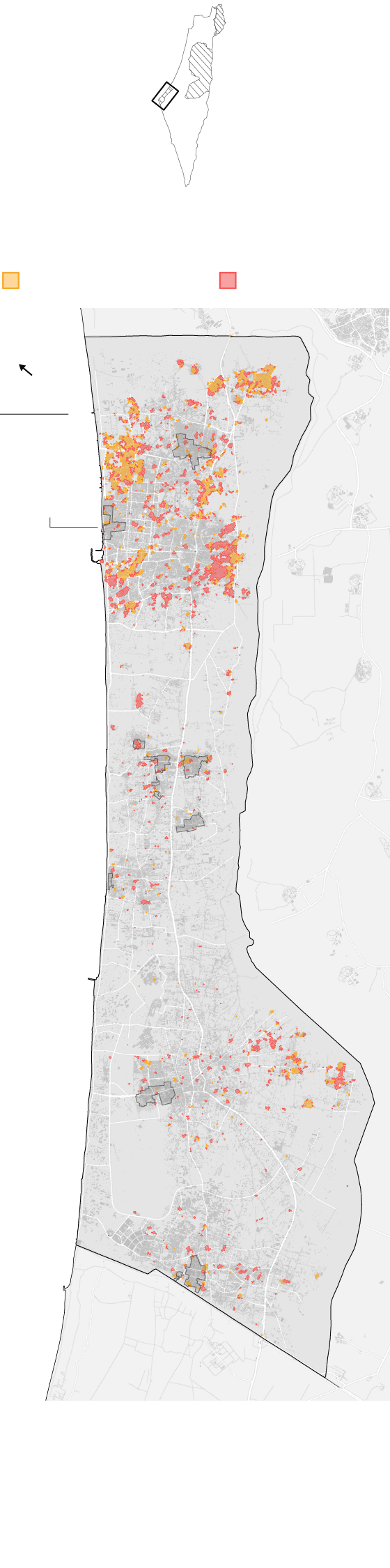 La destrucción llegó inmediatamente a la zona norte de la Franja, donde previamente vivía más de un millón de personas, de los dos que componían la población gazatí antes del inicio de la ofensiva. En el siguiente mapa se muestran los edificios dañados o destruidos en los primeros 10 días de guerra, a partir del análisis de imágenes satelitales que publicó la Universidad de Oregón.