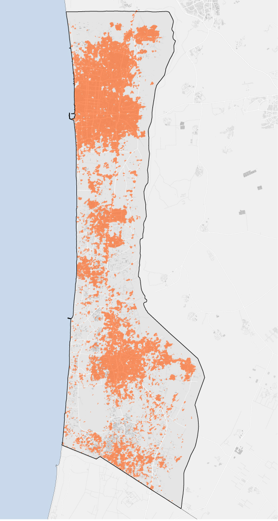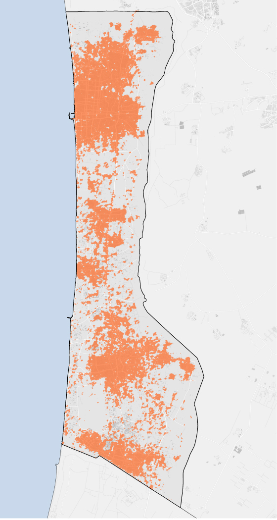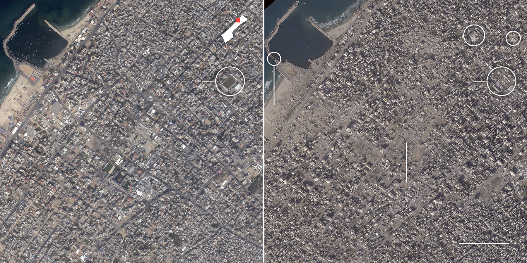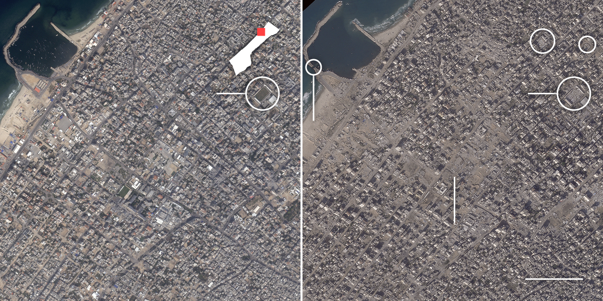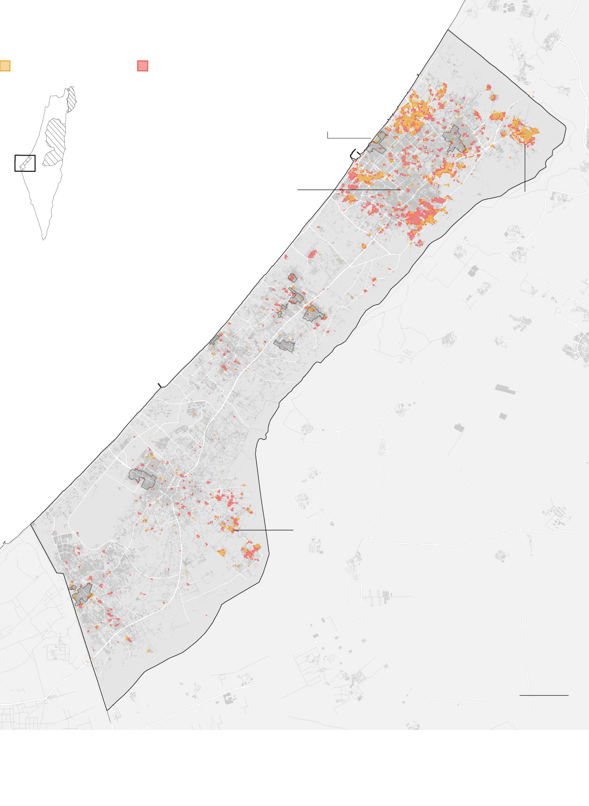 La destrucción llegó inmediatamente a la zona norte de la Franja, donde previamente vivía más de un millón de personas, de los dos que componían la población gazatí antes del inicio de la ofensiva. En el siguiente mapa se muestran los edificios dañados o destruidos en los primeros 10 días de guerra, a partir del análisis de imágenes satelitales que publicó la Universidad de Oregón.