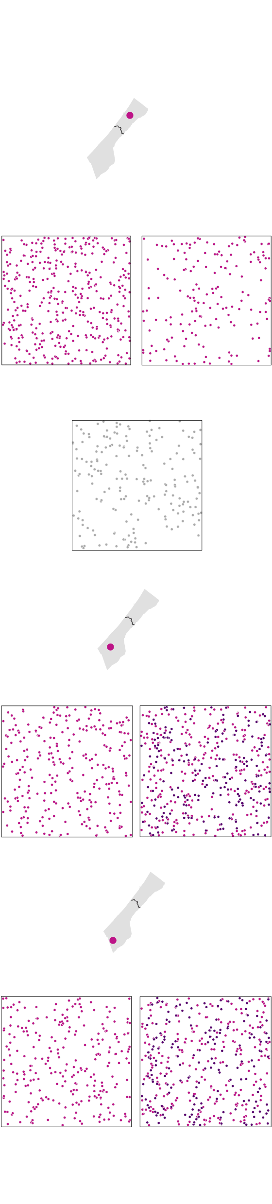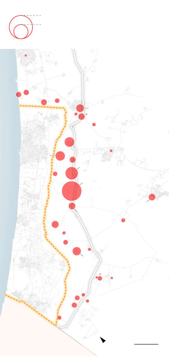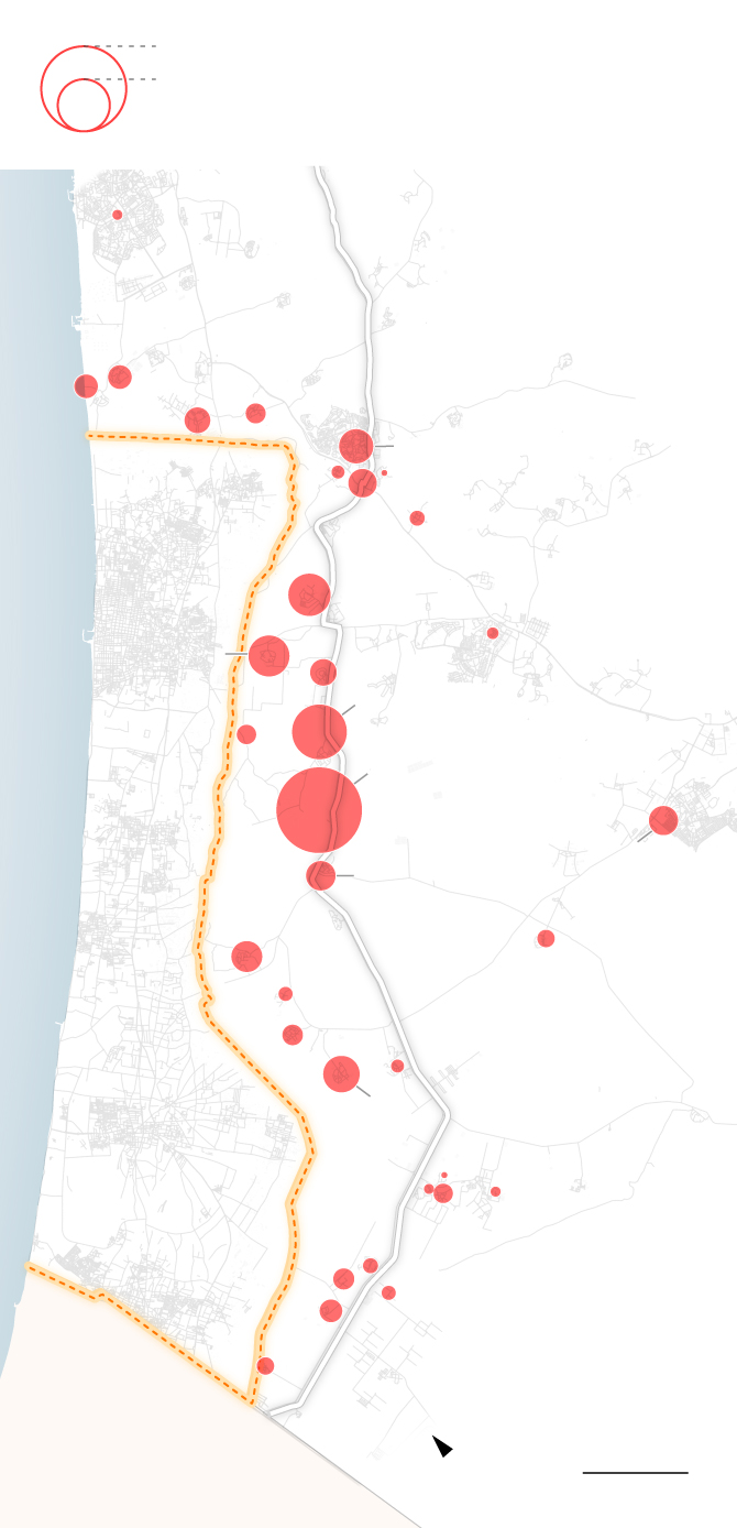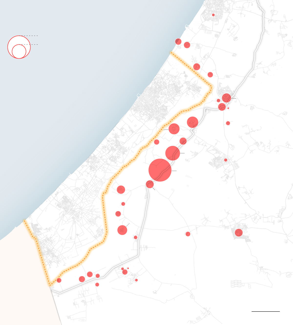 Cada punto es una de las 149 órdenes oficiales del ejército israelí para evacuar una zona. El tamaño, su extensión
