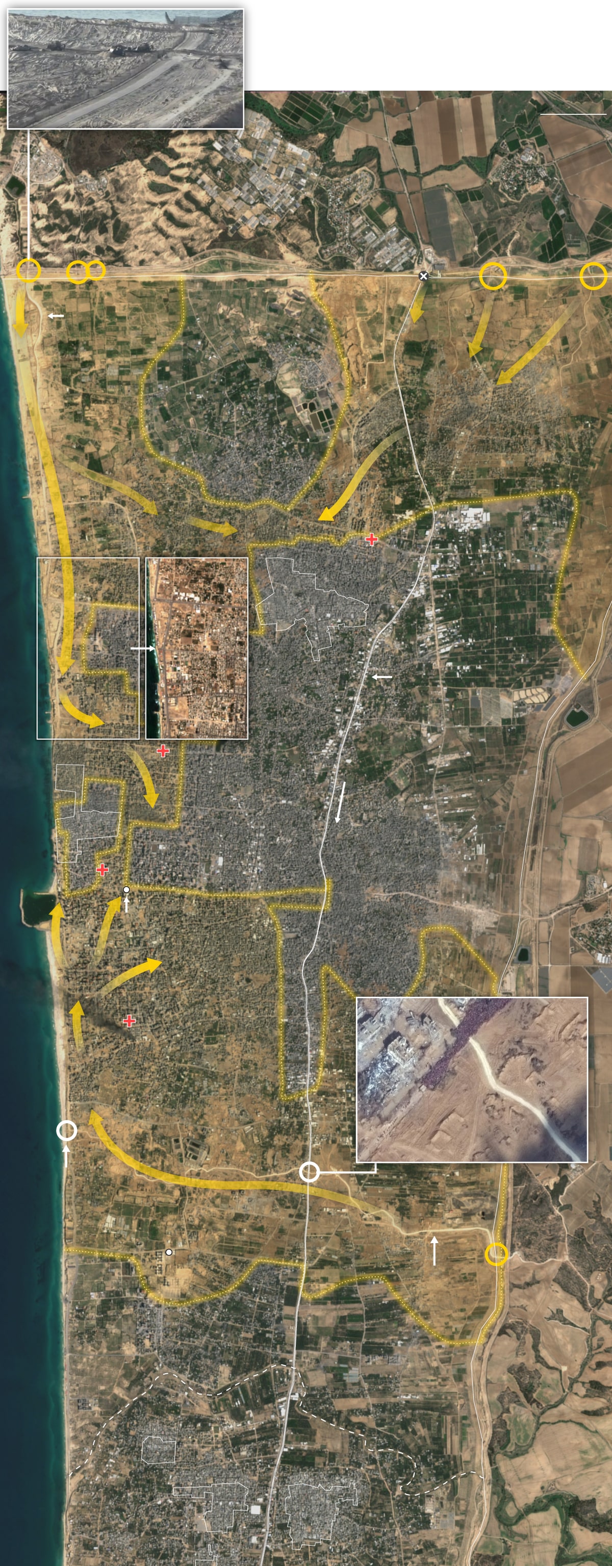 Ya desde el comienzo de la invasión, los residentes del norte de la Franja huyeron hacia las poblaciones del sur. En Ciudad de Gaza, donde se encontraban algunas de las manzanas de edificios más densas del mundo, escaparon de la noche a la mañana más de 600.000 personas. Jan Yunis fue el destino de muchos de los desplazados, y esta localidad llegó a doblar la población en pocos días: en algunas de las áreas más densas de esa ciudad, donde antes del conflicto vivían 270 personas por hectárea, pasaron a refugiarse hasta 540.