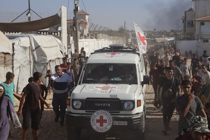 Miembros de la Cruz Roja llegan a un punto de Jan Yunis donde Hamás busca cuerpos de los rehenes israelíes. / HAITHAM IMAD / EFE