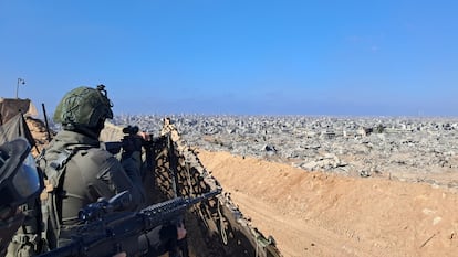 La única vida que se atisba en Sheyaia, en el norte de Gaza, son dos perros vagabundos. Se mueven entre las ruinas de lo que en su momento fue un ajetreado suburbio de la capital con más de 90.000 habitantes. Hoy parece un paisaje lunar, una alfombra de escombros hasta donde alcanza la mirada que, sin embargo, dos soldados israelíes vigilan atentos con el ojo en la mirilla de los rifles. Están apostados en un alto estratégico dentro de Gaza al que ha accedido este periódico, empotrado con las Fuerzas Armadas de Israel, en la primera vez que un grupo de periodistas extranjeros ingresa al enclave palestino desde el inicio del alto el fuego, el pasado día 10.