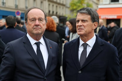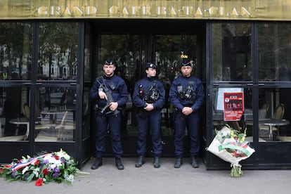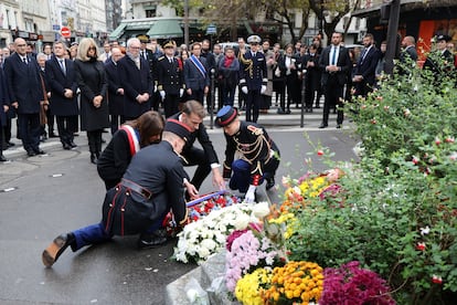 Un grupo de personas contempla un altar improvisado de flores depositadas en la estatua de la plaza de la República, en París, este jueves. Emma Da Silva (AP)François Hollande, junto a Manuel Valls conversan durante la ceremonia en homenaje a las víctimas del atentado terrorista del 2015, en la intersección de las calles Bichat y Alibert, junto a ‘Le Petit Cambodge’ y ‘Le Carillon’, este jueves en París. LUDOVIC MARIN (via REUTERS)Varias personas se reúnen antes de la ceremonia en homenaje a las víctimas en la intersección de las calles Bichat y Alibert, junto a los cafés ‘Le Petit Cambodge’ y ‘Le Carillon’, este jueves en París.LUDOVIC MARIN (via REUTERS)La alcaldesa de París, Anne Hidalgo, y el presidente de Francia, Emmanuel Macron, rinden homenaje a las víctimas junto a los cafés ‘Le Petit Cambodge’ y ‘Le Carillon’, en París, este jueves. Ludovic Marin (AP)Flores colocadas junto a los retratos de las víctimas y una placa conmemorativa cerca de unos de los lugares atacados en los atentados de París, este jueves.LUDOVIC MARIN / POOL (EFE)El presidente francés, Emmanuel Macron, y la alcaldesa de París, Anne Hidalgo, depositaron una ofrenda floral en homenaje a las víctimas en la intersección de Faubourg du Temple y Boulevard Jules Ferry, cerca del café La Bonne Bière, en París.LUDOVIC MARIN (via REUTERS)Desde la izquierda, Arthur Denouveaux, presidente de la asociación francesa de víctimas Life for Paris; Anne Hidalgo, alcaldesa de París; Emmanuel Macron, presidente de Francia; Brigitte Macron, esposa de Emmanuel Macron, y Philippe Duperron, presidente de la asociación 13onze15 Fraternité et Verité, rinden homenaje a las víctimas cerca de uno de los lugares atacados en los atentados de París.LUDOVIC MARIN / POOL (EFE)Agentes de policía custodian las inmediaciones de la sala de conciertos Bataclan, este jueves.Associated Press/LaPresse (APN)