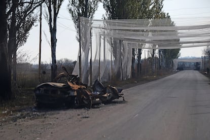 Recorren a toda velocidad una carretera que en algunos tramos está cubierta de redes, como para formar un túnel que intenta, sin éxito, evitar los ataques de drones. Da igual que el vehículo azul vaya con los indicativos perfectamente visibles de la organización humanitaria. También se convierte en objetivo, como ocurrió el 8 de noviembre, cuando la furgoneta sufrió graves daños, dos semanas después de la misión en la que les acompañó este periódico.