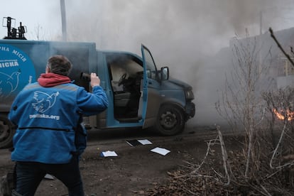 “Yo ahora me pongo el chaleco de forma concienzuda para todo”, agrega Senovilla en conversación telefónica. Tres días después de esa llamada, un dron ruso impacta en la furgoneta blindada y perfectamente identificada en la que, junto a otro periodista, Senovilla acompaña a dos trabajadores de la ONG Proliska a evacuar vecinos de la asediada Kostiantinivka. “Esto no era un vehículo militar ni estábamos cerca de una trinchera”, defiende ella. No hay heridos, pero el vehículo queda gravemente dañado. “Por su puesto que voy a seguir. Esto lo único que pone de manifiesto es que cada ve es más difícil hacer el trabajo de periodista”, subraya. “Los pobres evacuadores, ni te cuento”, sentencia.