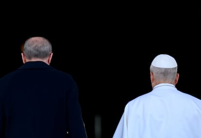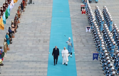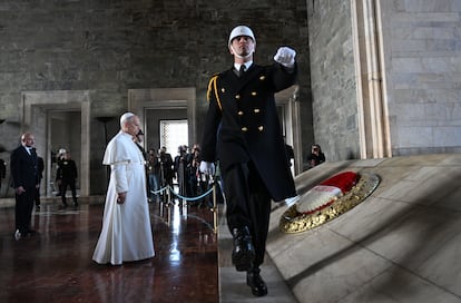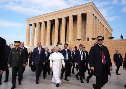 El presidente turco, Recep Tayyip Erdogan, recibe al papa León XIV en una ceremonia oficial de bienvenida en el Complejo Presidencial de Ankara.Anadolu (Anadolu via Getty Images)El Papa (a la izquierda) y el presidente turco, Tayyip Erdogan, este jueves en Ankara.Murat Cetinmuhurdar/PPO (via REUTERS) El presidente turco, Recep Tayyip Erdogan (a la izquierda), recibe al papa León XIV, en una ceremonia oficial de bienvenida en el Complejo Presidencial de Ankara.Anadolu (Anadolu via Getty Images)El Papa León XIV visita Anitkabir, el mausoleo del fundador de la República Turca, Mustafa Kemal Ataturk.Anadolu (Anadolu via Getty Images)El Papa asiste a una ceremonia de ofrenda floral durante su visita a Anitkabir, el mausoleo del fundador de la República Turca, Mustafa Kemal Ataturk.Anadolu (Anadolu via Getty Images)El papa León XIV asiste a una ceremonia de bienvenida a su llegada al aeropuerto internacional de Esenboga, en Ankara (Turquía).Yara Nardi (REUTERS)El pontífice observa desde el avión papal, este jueves, a su llegada al aeropuerto internacional de Esenboga en Ankara.Khalil Hamra (AP)El avión papal aterrida en el aeropuerto internacional de Esenboga en Ankara.Khalil Hamra (AP)León XIV conversa con la prensa en el interior del avión papal. Domenico Stinellis (AP)El pontífice saluda a la tripulación antes de partir en su primer viaje internacional a Turquía y Líbano, dos destinos que había previsto Francisco, pero que cobran aún mayor importancia ante la complicada situación en Oriente Medio.Vatican Media/Mario Tomassetti (EFE)El Papa accede al avión de la compañía Ita Airways, en el que viajan unos 70 periodistas de medios de todo el mundo, en el aeropuerto de Fiumicino (Roma).Alessandra Tarantino (AP) Leo XIV saluda antes de viajar a Turquía y Líbano, este jueves en el aeropuerto de Fiumicino.Vatican Media/EFEDetalle del calzado del papa León XIV mientras accede al avión papal.