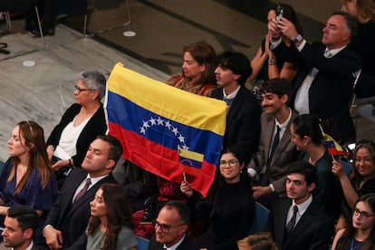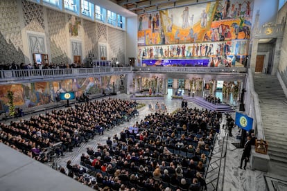 Ana Corina Sosa, hija de la galardonada con el Premio Nobel de la Paz, acepta el premio en nombre de su madre, la líder opositora venezolana María Corina Machado, este miércoles durante la ceremonia del Nobel de la Paz en el Ayuntamiento de OsloOle Berg-Rusten (AP)Ana Corina Sosa Machado, durante el discurso en nombre de su madre. Ole Berg-Rusten (via REUTERS)Ana Corina Sosa sostiene la medalla acreditativa del Nobel de la Paz otorgado a su madre. Stian Lysberg Solum (AP)Familiares de María Corina Machado aplauden a su hija tras el discurso en la ceremonia de entrega del Nobel de la Paz. Ole Berg-Rusten (AP)El rey Harald de Noruega, la reina Sonia, el príncipe heredero Haakon, la princesa heredera Mette-Marit y la princesa Ingrid Alexandra aplauden al final del discurso de Ana Corina Sosa Machado. Leonhard Foeger (REUTERS)Corina Parisca de Machado, durante la ceremonia de entrega del Nobel de la Paz a su hija, este miércoles en el Ayuntamiento de Oslo. Ole Berg-Rusten (via REUTERS)Asistentes a la ceremonia de entrega del Nobel de la Paz ondean la bandera venezolana.Leonhard Foeger (REUTERS)Vista general del ayuntamiento de Oslo durante la entrega del Premio Nobel de la Paz a María Corina Machado este miércoles. Stian Lysberg Solum (via REUTERS)El candidato presidencial opositor venezolano en las elecciones de 2024, Edmundo González, junto a su esposa Mercedes López, en el Ayuntamiento de Oslo antes de la ceremonia de entrega del Premio Nobel de la Paz, en Oslo.Ole Berg-Rusten (AP)La madre de la galardonada con el Premio Nobel de la Paz, Corina Parisca de Machado, llega al Ayuntamiento de Oslo antes de la ceremonia de entrega del Premio Nobel de la Paz, en Oslo, Noruega, este miércoles. Ole Berg-Rusten (AP)El presidente de Panamá, José Raúl Mulino, la primera dama Maricel de Mulino y el presidente de Argentina, Javier Milei, asisten a la ceremonia de entrega del Premio Nobel de la Paz a la líder opositora venezolana María Corina Machado, en Oslo.