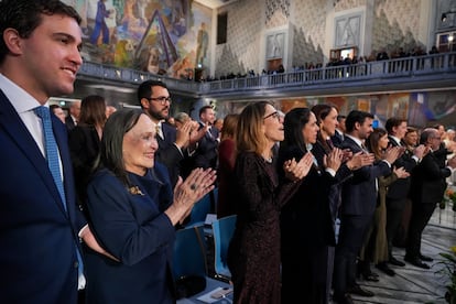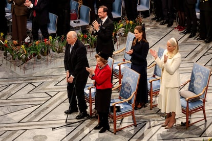 Una imagen de la galardonada con el Premio Nobel de la Paz, María Corina Machado, se exhibe en el Ayuntamiento de Oslo antes de la ceremonia de entrega del Premio Nobel de la Paz, en Oslo, Noruega, el 10 de diciembre de 2025. OLE BERG-RUSTEN / POOL (EFE)El rey Harald V de Noruega, la reina Sonia, el príncipe heredero Haakon, la princesa heredera Mette-Marit y la princesa Ingrid Alexandra reciben a la hija de la galardonada con el Premio Nobel de la Paz, Ana Corina Sosa (tercera por la izquierda), en una audiencia en el Palacio Real de Oslo, Noruega.HEIKO JUNGE / POOL (EFE)De derecha a izquierda, Ana Corina Sosa, hija de la galardonada con el Premio Nobel de la Paz María Corina Machado, la princesa heredera Mette-Marit y la princesa Ingrid Alexandra asisten a la fiesta del Premio de la Paz de Save the Children en el Centro Nobel de la Paz, antes de la ceremonia del Nobel, en Oslo, este miércoles.Gorm Kallestad (AP)Ana Corina Sosa, hija de la galardonada con el Premio Nobel de la Paz María Corina Machado, asiste a la fiesta del Premio de la Paz de Save the Children en el Centro Nobel de la Paz, este miércoles. GORM KALLESTAD (EFE)
