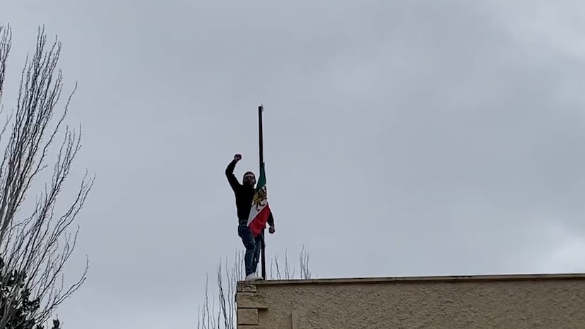 Un activista cambia la bandera de la República Islámica de Irán de la embajada de Madrid por la previa a la revolución de 1979