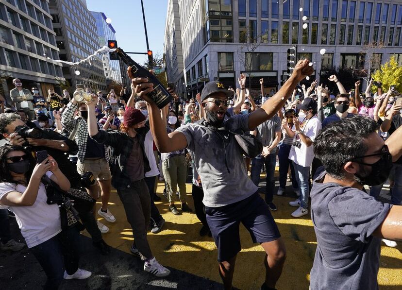 Washington llevaba una semana muda. Las oficinas y los locales comerciales se escondían detrás de las planchas de madera para protegerse de posibles disturbios y las pesadas nubes grises tenían a la ciudadanía guardada en sus casas. Pero hacia el mediodía de este sábado llegó la noticia que le cambió el rostro a la capital estadounidense en cuestión de minutos: Joe Biden, el candidato por el que más del 90% de los electores de la ciudad había votado, era electo presidente de Estados Unidos. Hasta el sol se abrió paso y miles de personas se arrojaron a las calles ignorando las recomendaciones en medio de la pandemia para celebrar tras días conteniendo la respiración. “Estás despedido”, le gritaban los jóvenes a Donald Trump en una ambiente de jolgorio absoluto fuera de la Casa Blanca. Sin embargo, la última imagen que circulaba del presidente estadounidense era en su club de golf de Virginia.