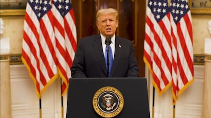 Es difícil pensar en una semana que transmita tanta derrota y soledad como esta última que ha pasado Donald Trump en el número 1600 de la Avenida Pensilvania de Washington. Abandonado por su círculo político más fiel, con la agenda completamente en blanco y huérfano del altavoz de las redes sociales, el empresario adicto a los focos deja la presidencia en un ambiente de luto. Este martes, sobre las cuatro de la tarde (hora de Washington), la Casa Blanca difundió su discurso de despedida del pueblo estadounidense en el que glosó los que considera grandes logros de su Gobierno y lanzó un mensaje a las bases: “Este movimiento acaba de empezar”.