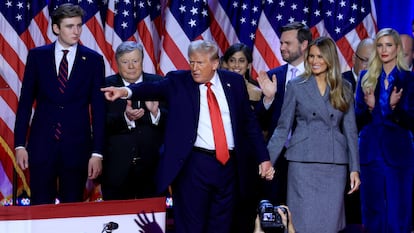 Empresarios multimillonarios como Elon Musk, personajes polémicos y una gran familia encabezada por Melania y su hijo Barrow han acompañado a Trump en Florida durante la celebración de la noche electoral estadounidense. Es el movimiento conocido como MAGA (’make america great again’). La corresponsal de EL PAÍS en Los Ángeles (California) María Porcel analiza en este vídeo cómo es la familia y los colaboradores más íntimos de los nuevos inquilinos de la Casa Blanca.