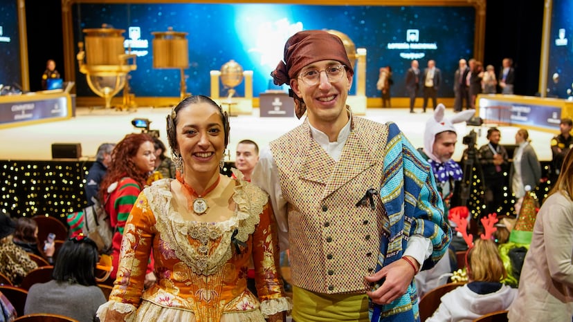 Los periodistas se apostan en los palcos y por el borde del patio pulula esa fauna que cada año se disfraza para asistir al sorteo. Están, como siempre, el hombre disfrazado de papa, el hombre disfrazado de obispo y otros clásicos de la jornada. Vicent y Elena vienen a esta fiesta desde Valencia hace seis años. El año pasado venían ataviados de zorritos, pero este han elegido trajes falleros propios de su comunidad: “Llevamos en Madrid desde ayer [sábado], hemos alquilado un piso y hemos traído a nuestras madres, que andan sentadas por ahí, para que nos ayuden con la logística”, explican. Se han levantado a las cuatro de la mañana para preparar el peinado de Elena.