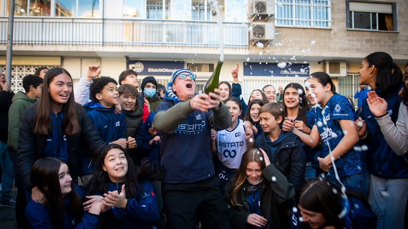 En una esquina del distrito de San Blas-Canillejas suena un bombo, huele a champán y la gente canta hasta quedarse afónica. Más de 700 personas comparten la alegría de llevarse un pellizco de El Gordo de la Lotería. Los afortunados compraron participaciones al Club Deportivo Distrito Olímpico, un club de baloncesto “humilde y de barrio”, describe Iñaki del Castillo, vocal de la junta directiva. La alegría comenzó primero en Logroño (La Rioja) a las 11.27 horas, cuando se cantó 72480. Parecía que había caído íntegro allí, pero minutos después los teléfonos empezaron a sonar también en este humilde barrio madrileño porque, desde hace años, el club compra lotería riojana porque “a alguien le cayó bien” el lotero. Lo que hace la simpatía. En cuestión de segundos los dos lugares se hermanaron por la euforia, aunque en la administración de La Rioja se brinda con vino.