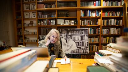 Como si el tiempo se hubiera detenido aquel 15 de mayo de 2012, todo está prácticamente igual en el escritorio de uno los grandes nombres del boom latinoamericano. Incluida la extensa biblioteca que se abre a la izquierda colonizando la pared de la habitación del estudio. Ocho filas de estanterías que van del suelo al techo. Es la zona de ensayos: filosofía, antropología, historia. Otras dos hileras ocupan el espacio de la esquina con traducciones al indio, al polaco o al chino de sus propias obras: La muerte de Artemio Cruz, Aura, Terra Nostra. Solo queda libre una pared con diplomas, la puerta y el ventanal que da paso a la azotea de la vivienda. Más de 14.000 títulos repartidos por toda la casa. Una elegante y ascética construcción de Luis Barragán, el único premio Pritzker mexicano, en un barrio residencial del sur de la Ciudad de México, donde se asentó la pareja tras los diferentes destinos del escritor como diplomático mexicano: París, Washington o Londres. En el apartamento que Lemus aún conserva en la capital inglesa hay otros 8.000 volúmenes.