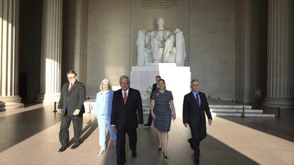 Un paseo por el memorial de Abraham Lincoln ha sido la actividad inicial de López Obrador en Estados Unidos. Es la primera visita de un mandatario mexicano a la capital estadounidense desde julio de 2016, cuando Enrique Peña Nieto se reunió con Barack Obama. Entonces, el mandatario del PRI voló en un flamante avión privado, que hoy es ofrecido en una venta que no encuentra comprador, acompañado de cuatro secretarios de Estado. López Obrador, en cambio, aterrizó en el aeropuerto de Dulles la noche del martes en el vuelo 1609 de Delta, después de haber hecho escala en Atlanta. Con él volaron su canciller, Marcelo Ebrard, la secretaria de Economía, Graciela Márquez, y su ayudante personal, Daniel Asaf. Todos ellos dejaron flores en recuerdo de Lincoln, Abe el honesto.