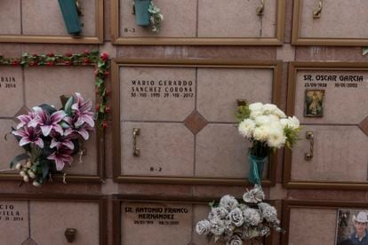 Han pasado casi dos semanas después de que le confirmaran a Susana que su hijo era uno de los cadáveres de la fosa. La insistencia del colectivo de familiares logró que el viernes 12 de junio llegaran por fin las ayudas para el ataúd, el coche fúnebre y el nicho. Después de reconocer por última vez el cuerpo en la morgue, un féretro beis ha estado cuatro horas en el garaje de la casa. No ha venido casi nadie de la familia a velar a Mario. La sobrina enferma de cáncer ha entrado hoy mismo en el quirófano y están casi todos en el hospital. Francisco se ha pasado toda la mañana repartiendo refrescos y galletas entre unos 30 asistentes. Un amigo de Mario ha pedido si podían meter un ramo de flores dentro del féretro. Susana ha estado sentada al lado del ataúd hasta que lo han vuelto a cargar en el coche para llevarlo al panteón. Después de la misa, una amiga ha cantado la ranchera Amor eterno. Cuando metían el ataúd en el nicho, Susana ha vuelto a llorar igual que lloró hace años cuando el féretro de su madre quedó para siempre guardado bajo tierra.