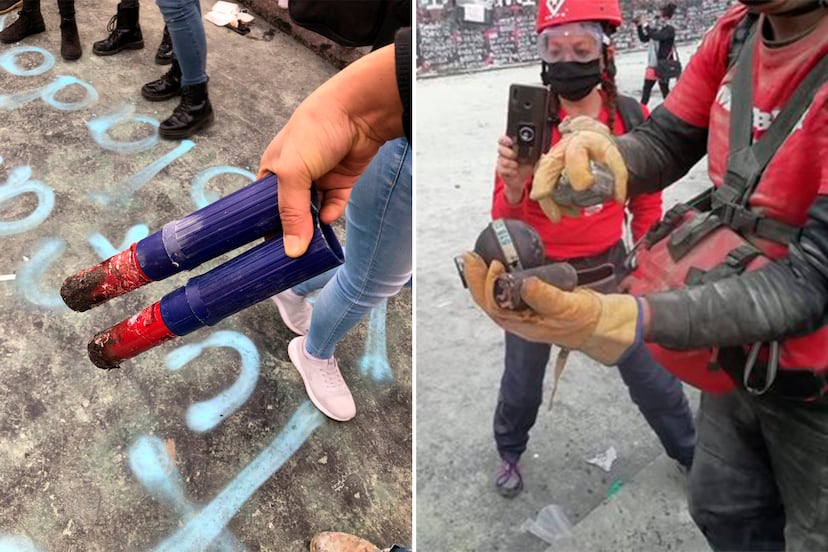 Otro de los elementos que se arrojaron ese día fueron bengalas, unos tubos de 15 centímetros con un mango que volaban por el aire prendidas fuego. Los vídeos que registraron la Brigada Marabunta y varios manifestantes muestran cómo son tiradas desde detrás de la valla que resguardaba al Palacio Nacional, sede del Ejecutivo mexicano, donde estaban los agentes policiales. También se ve a algunas manifestantes que las toman en sus manos y las devuelven al otro lado del vallado. Gómez-Tagle explica que ese dispositivo no está diseñado para usar en manifestaciones, y resulta más peligroso que el gas lacrimógeno porque “representan un alto riesgo de quemaduras”. Algunas de las manifestantes que tomaron las bengalas encendidas mostraban días posteriores en redes sociales las quemaduras en sus manos.
