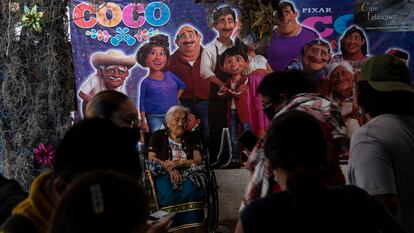 “Yo soy de Tijuana, pero venimos de California, en Estados Unidos. He visto la película unas 30 veces”, dice emocionada Luci Silva, con la inflamación del turista que ante la presencia de la anciana siente “un sueño hecho realidad”. Luci se tomará una foto con la centenaria, le dedicará unas palabras cariñosas y dejará la silla para el siguiente. El photocall luce un cartelón con los personajes de la animación y al lado, las dos botellas de oxígeno que alivian la insuficiencia pulmonar de la mujer. Doña Salud nunca ha visto la película y la silla de ruedas, dice su nieta Paty, solo la usa para descansar. En efecto, ella se levanta sola, apenas ayudada por un bastón, que blande cuando los más pequeños de su estirpe la molestan. Por las mañanas se pasea por el patio y riega sus plantas.