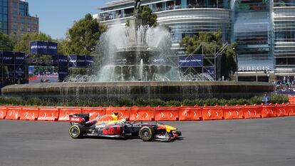 La escudería de la bebida energética montó un espectáculo de exhibición sobre un trozo de la gran avenida de Ciudad de México, Paseo de la Reforma. El protagonista era Sergio Pérez, que con un viejo coche, un RB7, ensordeció a los más de 100.000 aficionados que se reunieron, según las cifras oficiales. Nunca en la historia un conductor de Fórmula 1 había corrido cobijado por los monumentos del Ángel de la Independencia y la Diana Cazadora. En 2015, la empresa del búfalo rojo pidió permiso para quemar los neumáticos sobre el asfalto de las calles del Zócalo. El español Carlos Sainz Jr. y el australiano Daniel Ricciardo se dieron un baño de masas. Pero con Sergio Pérez todo fue un jolgorio sobre una vialidad que, en cualquier otro día, está llena de baches. Las brigadas reparan cada tres días de 1.000 a 1.500 desniveles en toda la capital mexicana, de acuerdo con cifras de la Secretaría de Obras y Servicios.