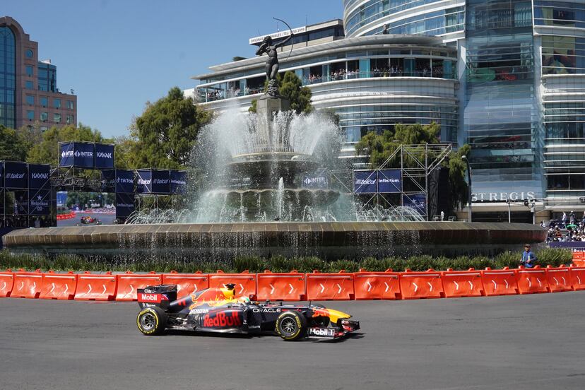 La escudería de la bebida energética montó un espectáculo de exhibición sobre un trozo de la gran avenida de Ciudad de México, Paseo de la Reforma. El protagonista era Sergio Pérez, que con un viejo coche, un RB7, ensordeció a los más de 100.000 aficionados que se reunieron, según las cifras oficiales. Nunca en la historia un conductor de Fórmula 1 había corrido cobijado por los monumentos del Ángel de la Independencia y la Diana Cazadora. En 2015, la empresa del búfalo rojo pidió permiso para quemar los neumáticos sobre el asfalto de las calles del Zócalo. El español Carlos Sainz Jr. y el australiano Daniel Ricciardo se dieron un baño de masas. Pero con Sergio Pérez todo fue un jolgorio sobre una vialidad que, en cualquier otro día, está llena de baches. Las brigadas reparan cada tres días de 1.000 a 1.500 desniveles en toda la capital mexicana, de acuerdo con cifras de la Secretaría de Obras y Servicios.