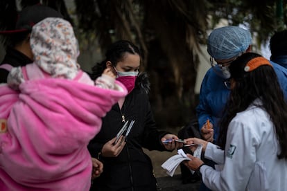 Méndez se ha traído una gruesa chamarra roja por si la espera vuelve a eternizarse y le acompaña su abuela Blanca Estela Vélez. Antigua enfermera en el IMSS, ella ha venido a intentar agilizar el trámite, sin mucho éxito. “Me dan ganas de regresar a trabajar aquí para organizar esto, porque hace falta. ¿Cómo es posible que tengan a los positivos formados con los que no lo son?”, pregunta, abriendo mucho los ojos. En la fila, los que buscan la incapacidad y los que van a hacerse la prueba se lanzan miradas incómodas y maniobran para mantenerse a distancia.