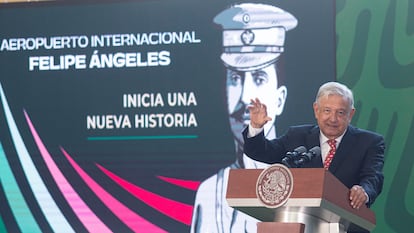 El presidente Andrés Manuel López Obrador madrugó más de lo habitual este lunes para demostrar en primera persona que el nuevo aeropuerto no está tan lejos. A las 5 de la madrugada, esquivando el proverbial tráfico de la capital de México, López Obrador tardó poco más de 30 minutos en recorrer en coche los 45 kilómetros que separan el Palacio Nacional de los terrenos del Estado de México donde se levanta la nueva terminal. Desde el Aeropuerto Internacional Felipe Ángeles (AIFA) dio su conferencia matutina diaria y sacó pecho de la obra: “misión cumplida”. En menos de tres años desde que arrancaron las obras, el presidente inauguró este lunes uno de sus proyectos estrella.