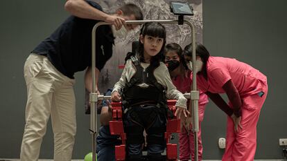 Los pacientes que van a usarlo en México son prácticamente todos de esta segunda categoría. Valeria Baeza lleva seis años en silla de ruedas: apenas tiene movilidad en las piernas ni en su brazo derecho. Llega con gafas rosas, moño rosa y una sonrisa gigante a saludar a Ximena, montada en el exoesqueleto. A ella le tocó probarlo hace dos días y se puso a bailar. Hoy deja que Ximena sea quien empuje su silla. “La primera reacción cuando lo probó fueron unas carcajadas enormes. Estaba fascinada”, cuenta su madre, Alejandra Mohedano. “Al día siguiente me decía: ‘Súbeme al robot porque ya quiero caminar’. El hecho de sentir que estaba de pie la motivó por completo”, apunta.