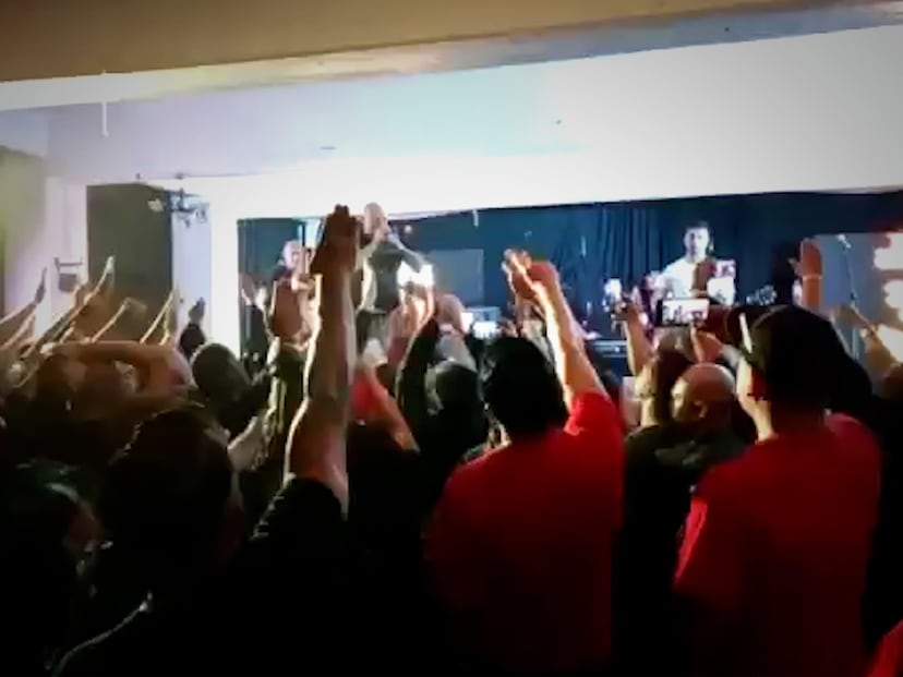 El saludo nazi acompañado de las palabras “Sieg Heil” (expresión en alemán usada en los encuentros políticos del Tercer Reich, y que se puede traducir como “salve, viva, eterna victoria”) cobró presencia al pasar la noche. Decenas de integrantes del público lo coreaban entre canción y canción, e incluso, algunos de los músicos hicieron la seña antes de bajar del escenario. Ante el calor acumulado en la sala, los asistentes comenzaron a retirarse los abrigos, revelando todo tipo de tatuajes en cuellos y brazos. Abundaban los diseños de esvásticas, frases en alemán y algún que otro retrato de Adolf Hitler.