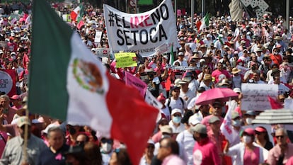 Miles de personas marcharon este domingo por las calles de Ciudad de México, y otro puñado de ciudades del país, para protestar contra la reforma electoral del presidente Andrés Manuel López Obrador. Los cambios constitucionales impulsados por Morena, una de las apuestas clave del gobierno, han concentrado por primera vez y de forma clara a los sectores opositores en lo que va de sexenio. Organizaciones civiles y partidos han salido a la calle bajo el lema de “el INE no se toca”, en referencia a la iniciativa presidencial que busca una revisión fondo del regulador electoral, así como del reparto de presupuestos para los partidos políticos.
