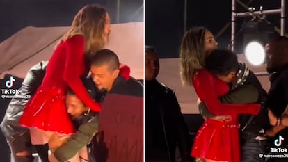 Minutos después el fanático es bajado del escenario y devuelto a la multitud. Belinda pide a su equipo que le den al hombre algo que parece una botella de agua. “Quédate ahí, te tomas esto y respiras porque casi te da algo. Me asustaste”, le dice al hombre. “Está pedito, no pasa nada”, agrega después la cantante. Entre gritos y aplausos de sus seguidores y con la cara claramente tensa, Belinda respira profundamente tras lo sucedido y como buena artista, continúa el show.