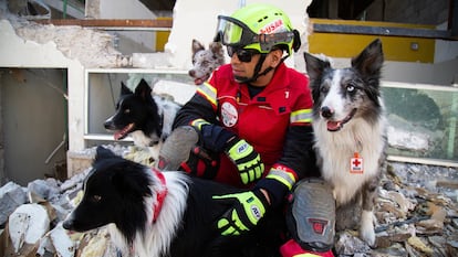 “Balám, ¡busca!”, ordena Edgar e Isaac le quita inmediatamente su collar. El rescatista canino se activa y se desplaza sobre el terreno accidentado con la facilidad de Usaín Bolt en los cien metros planos. Es efímero y veloz al correr, como un rayo. Tarda un minuto y 17 segundos en encontrar a Isaac. Una vez que lo tiene localizado comienza a ladrar con fuerza, refuerza su acierto con el olfato y rasca la calamina donde se encuentra Alan hasta que termina el ejercicio. “Muy bien, muy bien”, le hace fiesta el figurante y lo premia entregándole su pelota naranja. “Bien hecho, papi”. El perro no para de mover su cola.