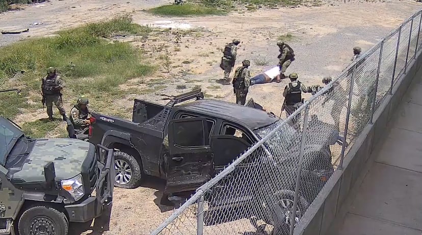La secuencia del caso del 18 de mayo recoge la parte final de una persecución que inició pasadas las 14.30, entre la calle Lago Chapala y la avenida Monterrey, en el sur de la la ciudad fronteriza. El video inicia cuando una camioneta oscura de media cabina cruza a toda velocidad la avenida Monterrey y se estrella contra un muro, justo debajo de la cámara de seguridad de un centro comercial. Son las 14.36. Tras el choque, militares aparecen caminando, apuntando a la camioneta. Un vehículo militar, conocido en el medio como Sand Cat, una especie de tanqueta de uso urbano, les apoya.