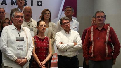 Concluye así la fase preliminar del proceso interno de Morena de cara a 2024, camino lleno de baches, roces e indirectas cruzadas entre los aspirantes. Este domingo, todos han comparecido juntos tras la reunión del Consejo, tratando de mostrar una unidad tutelada desde Palacio Nacional. Sheinbaum, Ebrard y Monreal han posado frente a la prensa, regalando sonrisas a las cámaras, junto al secretario de Gobernación, Adán Augusto López, el diputado Gerardo Fernández Noroña y el líder del Partido Verde, Manuel Velasco, aliado de Morena.