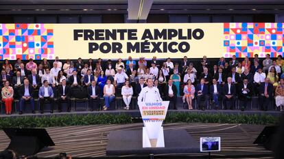 La alianza ha cambiado este lunes el nombre de Va por México a Frente Amplio por México en una búsqueda de saltearse los tiempos electorales que determina la ley, que recién autoriza a los partidos a realizar el proceso interno de selección a partir de noviembre. De esta forma, esperan encontrar entre junio y agosto lo que llaman un “responsable nacional de construir un frente amplio por México”, ha explicado Cortés. Ese será el nombre que le den al candidato presidencial para evitar posibles sanciones del Instituto Nacional Electoral (INE). Luego, cuando estén dentro de los plazos permitidos, el frente “podría transitar a una coalición”, ha agregado el presidente del PAN.