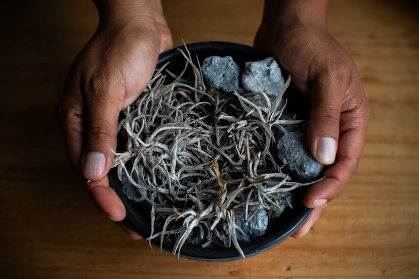 La florescencia de esta bromelia está encerrada en un cáliz de minúsculas espaditas, como el penacho que remata la piña, pero estas son rosáceas, lo que permite hermanarla a simple vista con otras de su familia que adornan las casas. El ojo experto de Viccon ya ha descrito algunas otras especies para la humanidad, a base de estudiar bromelias, orquídeas, helechos, peperomias y aráceas. Si teclean en su buscador sabrán de inmediato que alguna vez las tuvieron en sus domicilios. “Las bromelias se distribuyen entre los trópicos americanos, pero esta de Guanajuato es de roca, de climas áridos”. En efecto, la pequeña plantita es ruda y sus raíces abrazan las rocas y requieren poca lluvia para sobrevivir. “Tienen el característico color verde grisáceo y con tricomas, esos pelitos con los que absorben la poca humedad que haya en el ambiente”, cuenta Viccon, que ha perseguido este ejemplar desde que llegó al Charco hace cuatro años. “No es fácil descubrir una especie única y menos en un sitio estudiado al detalle durante 32 años, es un gran reto”.