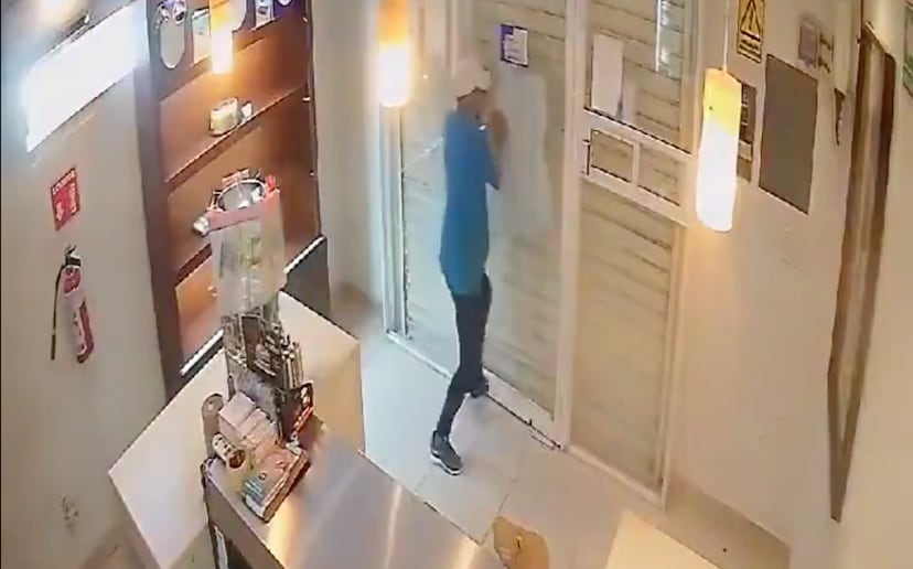 Allí, en lo alto de la pared, hay un ventanuco, pero está cerrado y solo sirve para que entre algo de luz. El ladrón vuelve a la sala principal desesperado, diciendo “no, no, no”, y encuentra un extintor colgado de la pared. Lo agarra, vuelve a la parte trasera y golpea el cristal hasta que consigue romperlo. Por fin escapa, mete su cuerpo por la pequeña abertura y sale al exterior. Medios locales aseguran que el individuo fue detenido por la policía poco después de darse a la fuga.
