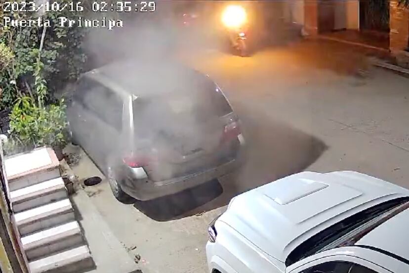 En el vídeo de una cámara de seguridad, se ve cómo dos personas pasan en moto frente a la casa y disparan contra la fachada