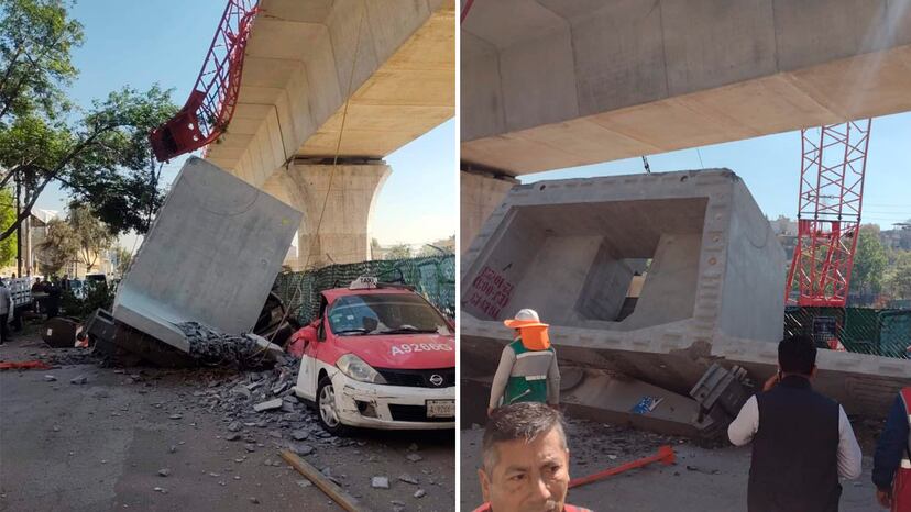Un pedazo de concreto cayó sobre dos vehículos en la alcaldía Álvaro Obregón, cerca del metro Observatorio, cuando una grúa hidráulica falló al maniobrar con la estructura. No hay personas heridas