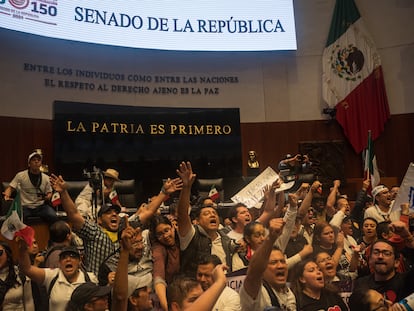 El senador del Partido Acción Nacional (PAN) Miguel Ángel Yunes Márquez ha reaparecido este martes durante la discusión de la reforma judicial para lanzarse a los brazos de Morena y con ello darle los 86 votos necesarios para sacar adelante el dictamen. Las sospechas sobre su ausencia en el PAN desde el lunes se iban acrecentando a medida que pasaban las horas. Nadie de su partido pudo localizarlo y no contestaba al teléfono. Después de pedir licencia durante la mañana por supuestos problemas de salud, el senador Yunes Márquez ha reaparecido muy sonriente, enfundado en un traje oscuro y junto a varios legisladores del oficialismo. “Vengo a esta tribuna a razonar mi voto, lo hago en mi condición de opositor al Gobierno con el que no he coincidido, pero soy un opositor racional”, ha dicho mientras sus compañeros de partido lo increpaban. “¡Eres un traidor!”, gritaban desde la bancada del PAN. “He determinado votar a favor del dictamen”, ha concluido su discurso, mientras los senadores de Morena coreaban con júbilo: “¡La reforma va!”, “¡La reforma va!”.