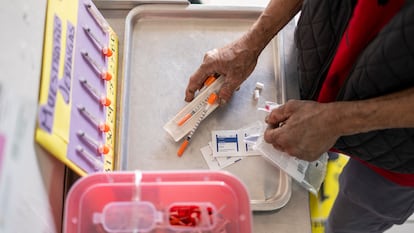 Hay, por ejemplo, una pareja que acude casi todas las semanas, reserva un hotel durante unos días, se droga y vuelve a Calexico. Uno de los días, él aparece bien peinado, con chamarra de cuero y mascarilla sanitaria para tapar la cara. Deja un puñado de jeringuillas usadas, recoge unas cuantas nuevas, declina educadamente una entrevista y se pierde entre las calles del barrio chino. Los perfiles que pasan por Verter suelen tener en común un primer contacto con los opioides en la adolescencia que nunca se han podido sacudir; orígenes en barrios dejados a su suerte, historias de soledad y aislamiento. Verter atiende a una población de unos 400 adictos. Ellos son mayoría, 80%. Ellas mueren más.