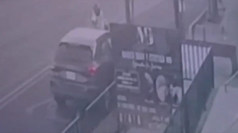 En las imágenes del vídeo de una cámara de seguridad se ve a uno de los dos atacantes, vestido de blanco, con casco, disparando contra el auto de Muñoz